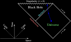 Popularna nauka tera na razmišljanje, naravno na čitaocu je da širi temu. Na slici je Penrouzov dijagram, koji predstavlja kako prostorvreme deluje. Možda je dovoljno objašnjenja da su bela područja levo i desno ona koja nisu, kako se kaže, kauzalno povezana - informacija ne stiže do njih i nazad, šta se tamo desi ne utiče ovde i vice versa (naravno, govori o događaju u prostoru I vremenu, aktere tog događaja možemo sresti kasnije)...
